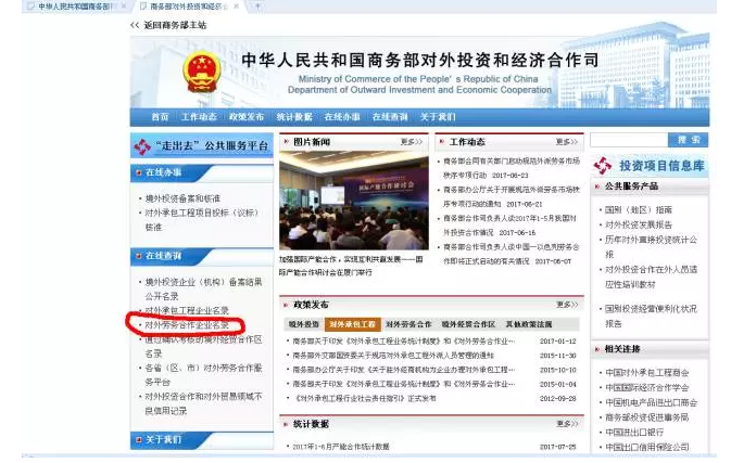 2、進(jìn)入商務(wù)部對(duì)外投資和經(jīng)濟(jì)合作司網(wǎng)站,點(diǎn)擊左側(cè)的對(duì)外勞務(wù)合作企業(yè)名錄