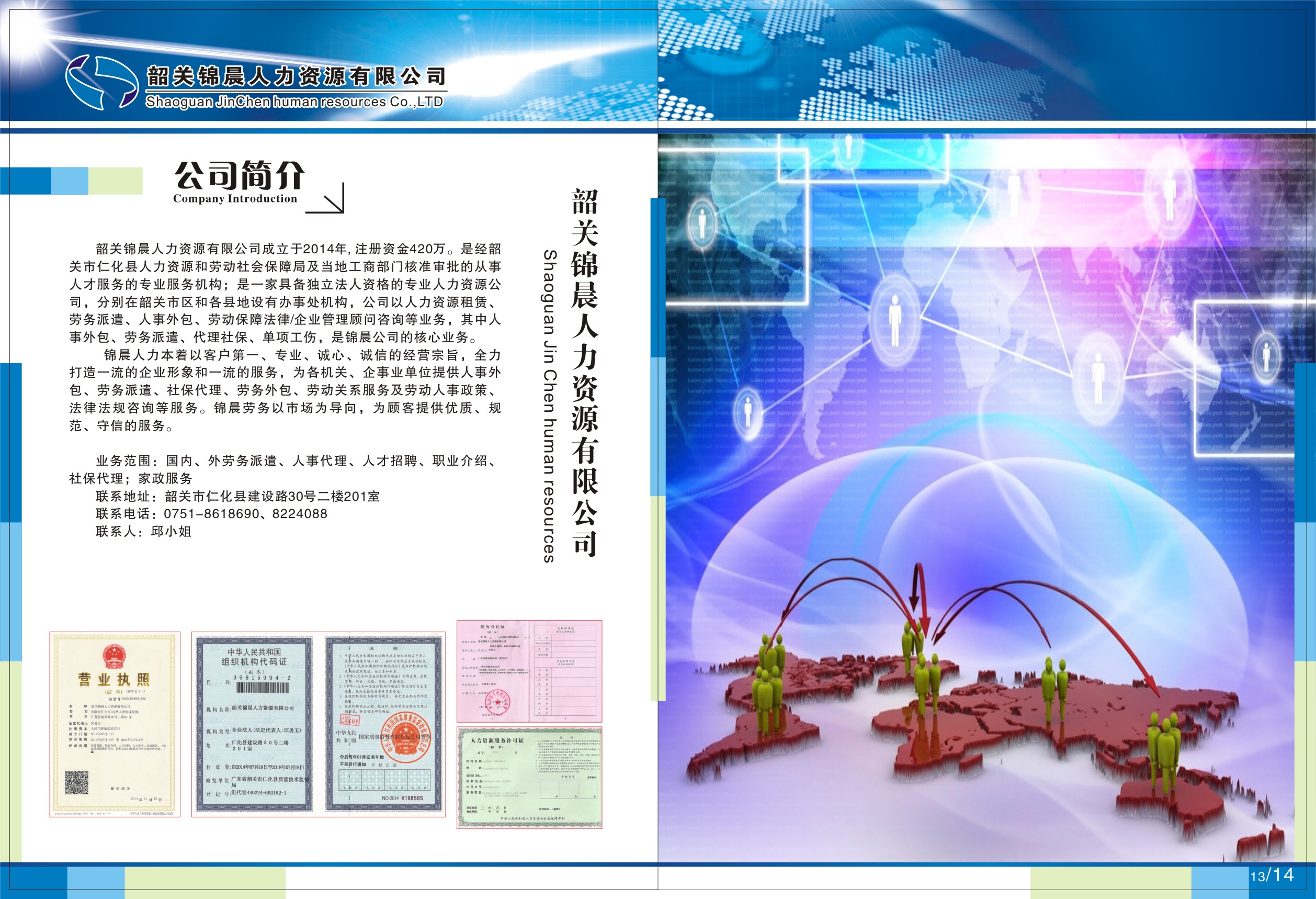 韶關(guān)錦晨人力資源有限公司成立于2014年, 注冊資金420萬。是經(jīng)韶關(guān)市仁化縣人力資源和勞動社會保障局及當(dāng)?shù)毓ど滩块T核準(zhǔn)審批的從事人才服務(wù)的專業(yè)服務(wù)機構(gòu);是一家具備獨立法人資格的專業(yè)人力資源公司,分別在韶關(guān)市區(qū)和各縣地設(shè)有辦事處機構(gòu),公司以人力資源租賃、勞務(wù)派遣、人事外包、勞動保障法律/企業(yè)管理顧問咨詢等業(yè)務(wù),其中人事外包、勞務(wù)派遣、代理社保、單項工傷,是錦晨公司的核心業(yè)務(wù)。