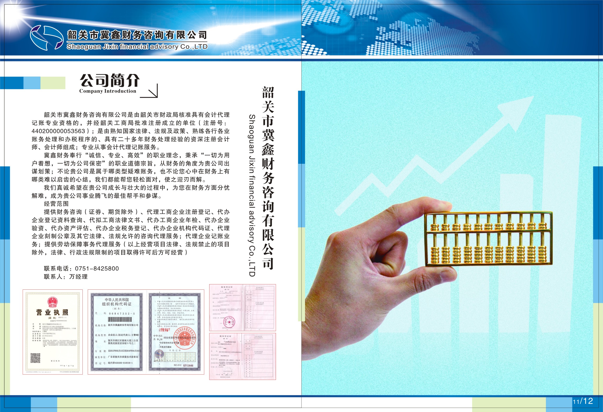 韶關市冀鑫財務咨詢有限公司是有韶關市財務局核準具有會計代理記賬專業(yè)資格的,并經韶關工商局批準注冊成立的單位(注冊號:440200000053563);是由熟知國家法律、法規(guī)及政策、熟練各行各業(yè)賬務處理和辦稅程序的、具有二十多年財務處理經驗的資深注冊會計師、會計師組成;專業(yè)從事會計代理記賬服務。